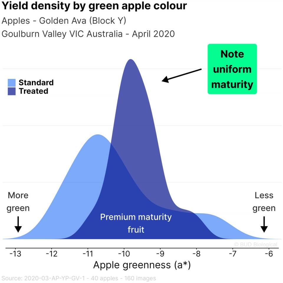 SUNRED and FOLICIST sprays for precision ripening improved the uniformity of Golden Ava apples at harvest.
